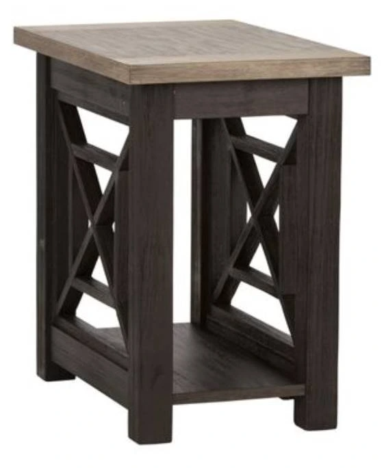 Enhance your space with the Heatherbrook chair side table. Crafted of poplar solids and acacia veneers, this piece features a charcoal and ash finish, bottom shelf for additional storage, appealing open grid end panels, anchored by a block leg design. This unique chair side table would be a wonderful accent piece in any home.Read More